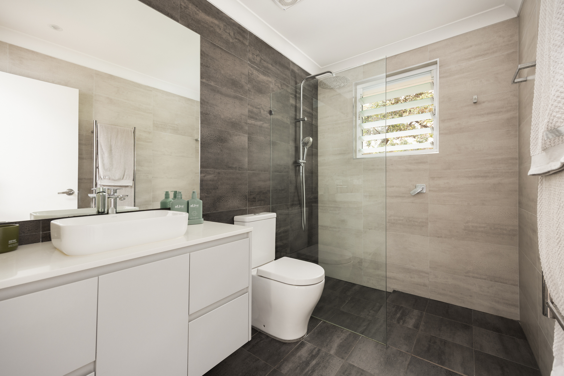 • Modern bathroom with sleek finishes and floor-to-ceiling tiles