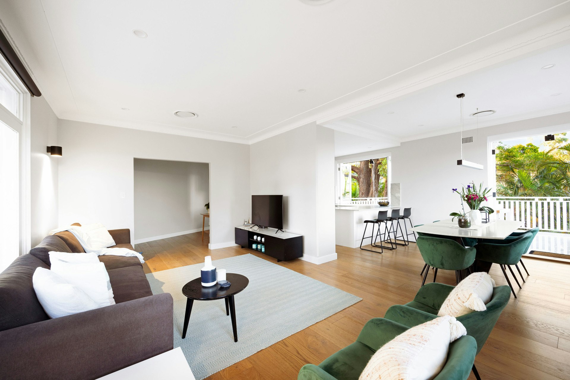 Lavish main living area flows to the front deck through glass doors