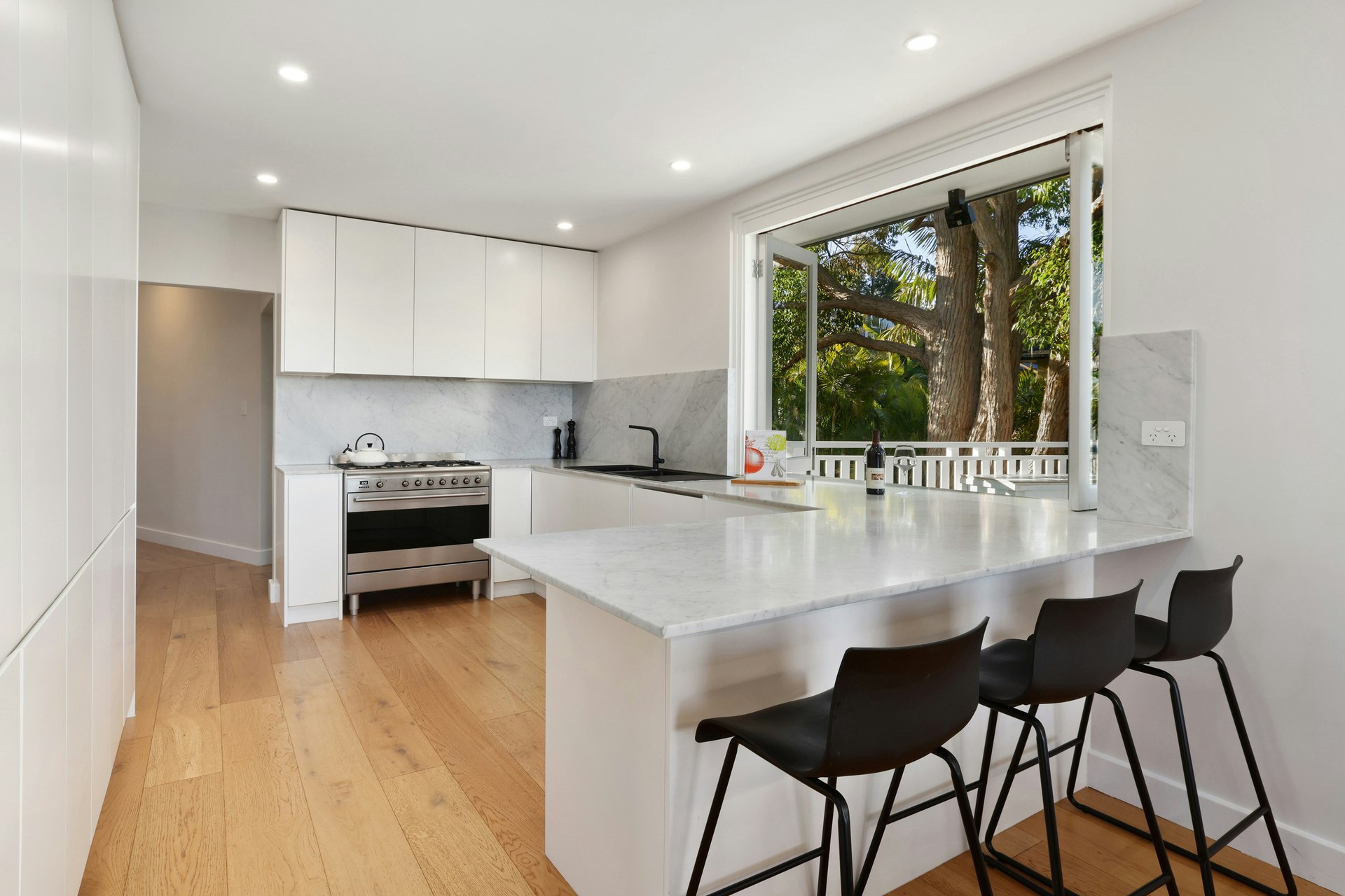 Breakfast bar, servery, generous bench space, soft closing cupboards, Smeg cooktop
