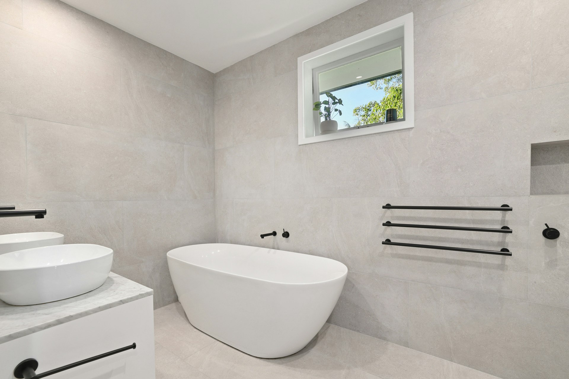 Stylish main bathroom fitted with freestanding tub, Rain shower and dual sink vanity