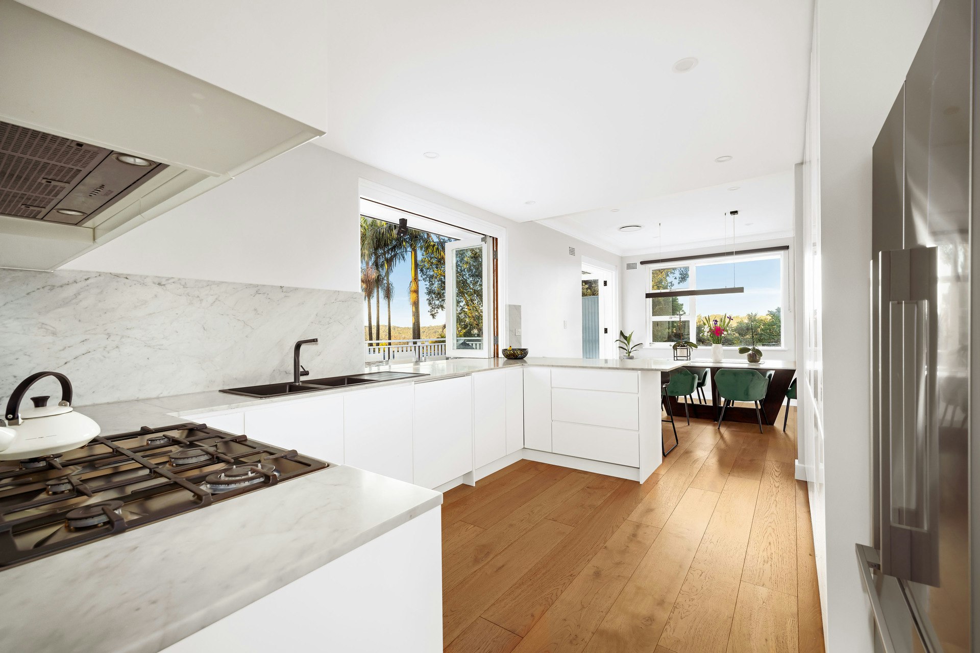 Contemporary gas kitchen with Natural Carrara Marble benchtops, dishwasher