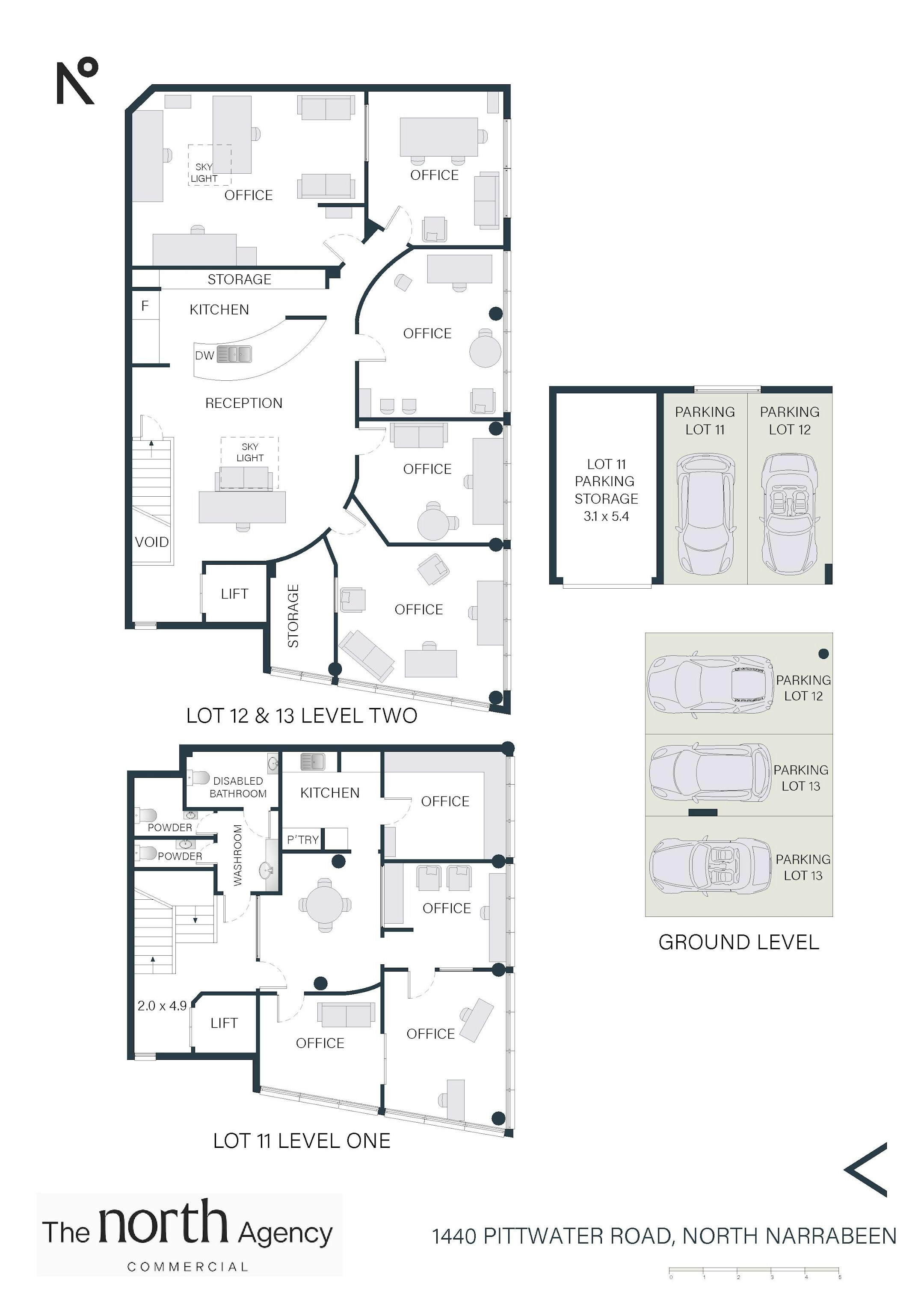 - Level 2 has large reception or open plan office, five individual offices and skylights