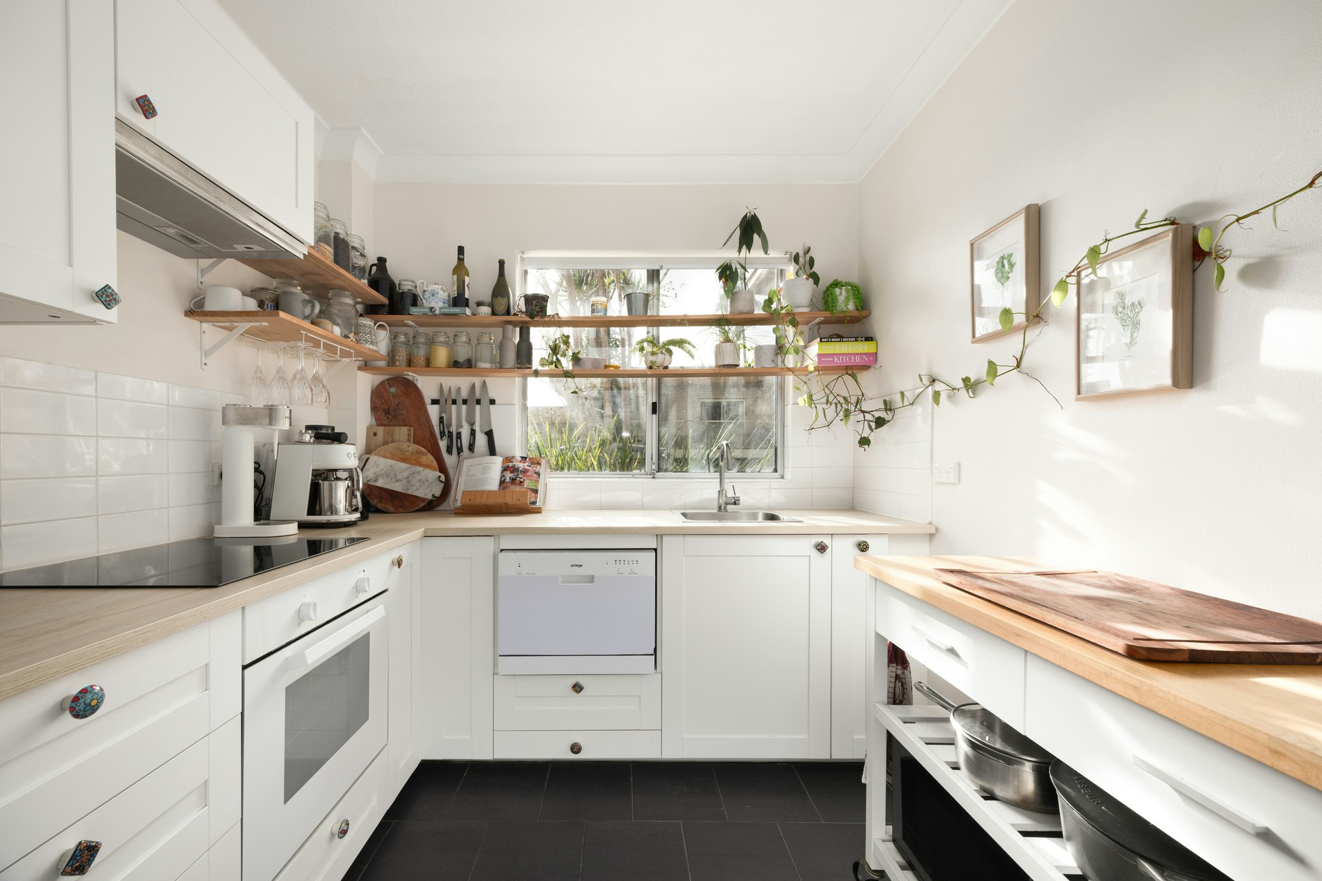 • Renovated kitchen (2019) with white appliances, stylish shelving, and ample storage