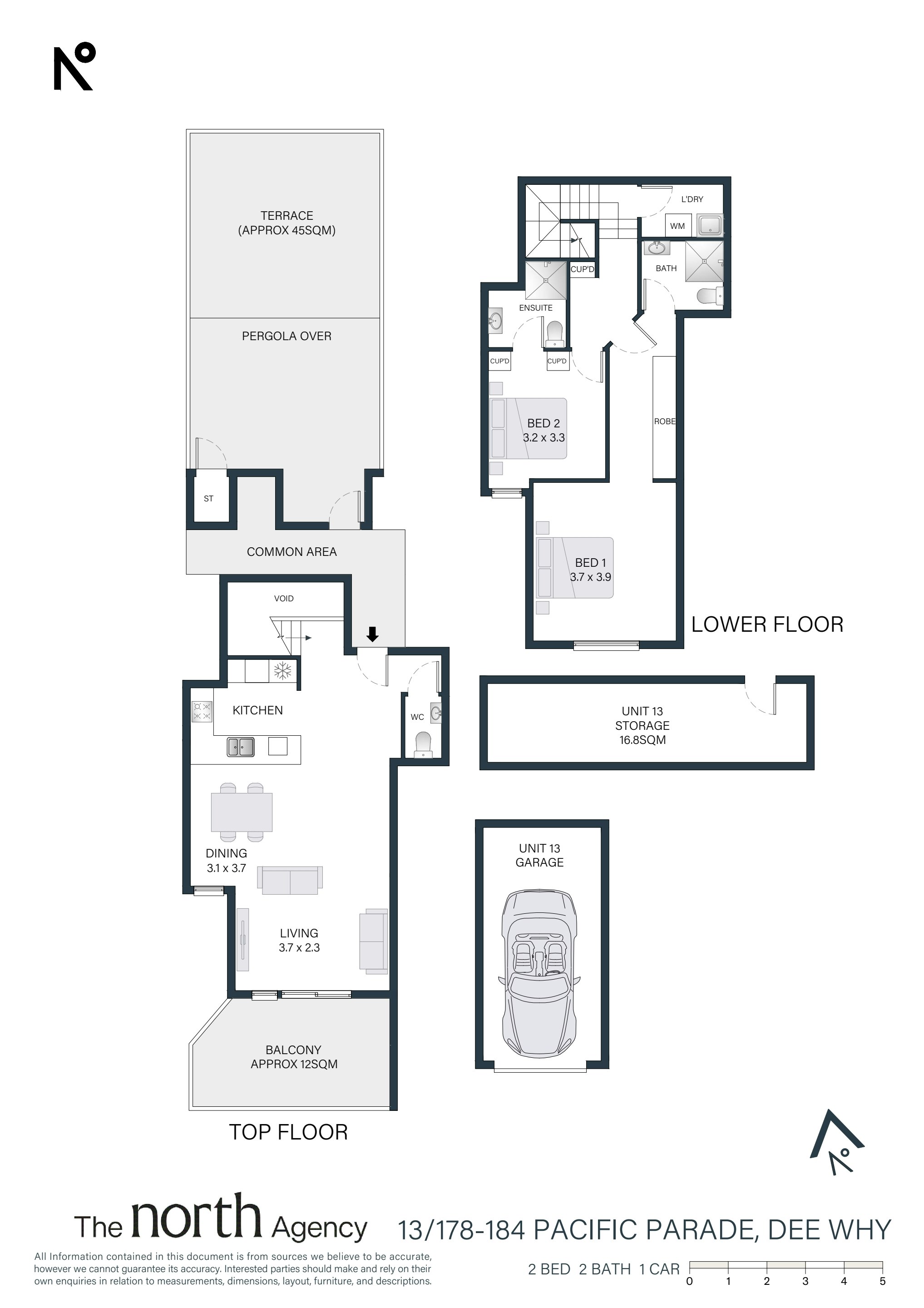 Thoughtfully designed across two levels, the lower floor accommodates the bedrooms, creating a peaceful retreat away from the living areas. The master bedroom enjoys the convenience of its own ensuite, while the second bedroom is well-proportioned and serviced by a modern bathroom.