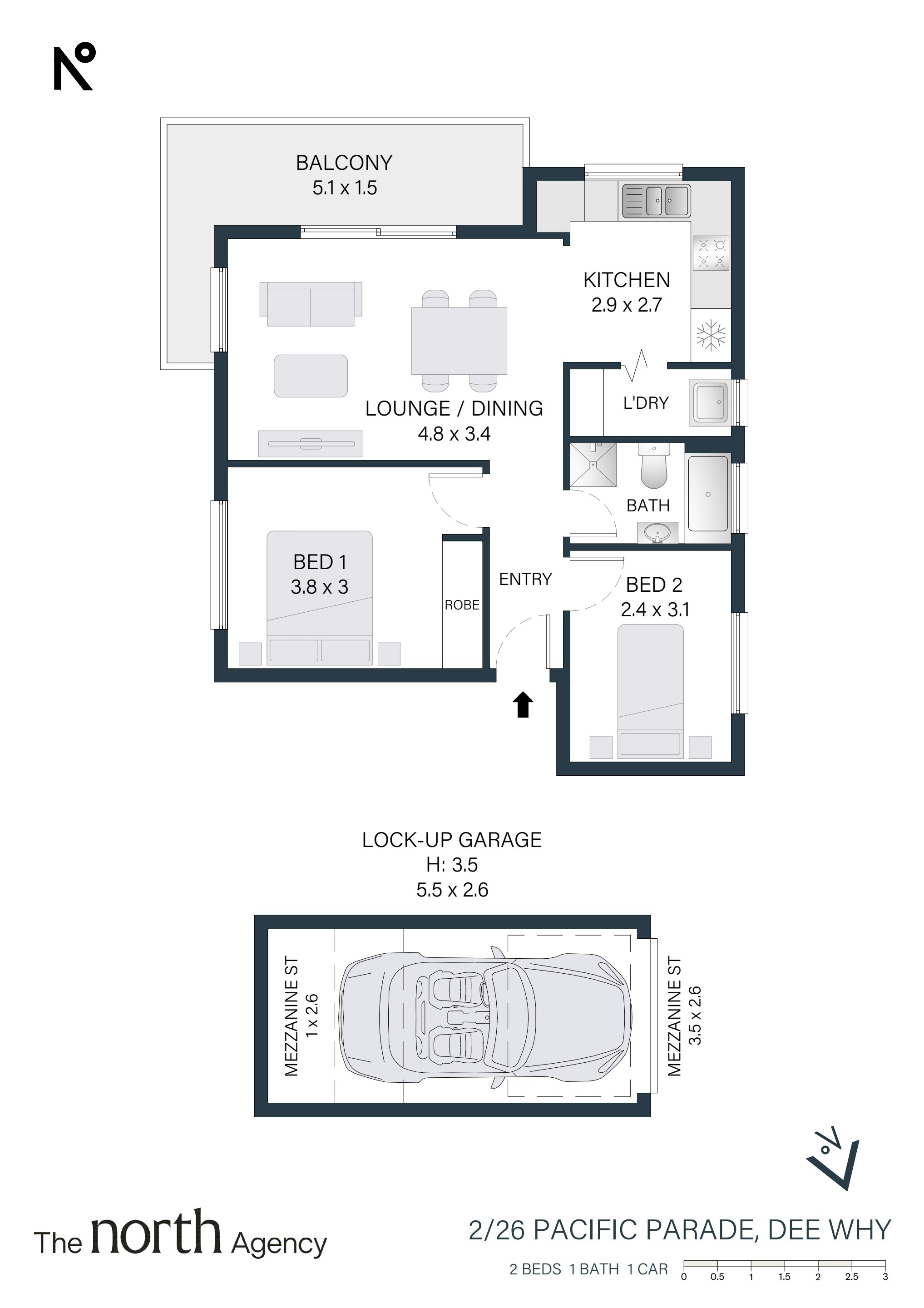 - Two spacious bedrooms with built-in robes and space for a desk