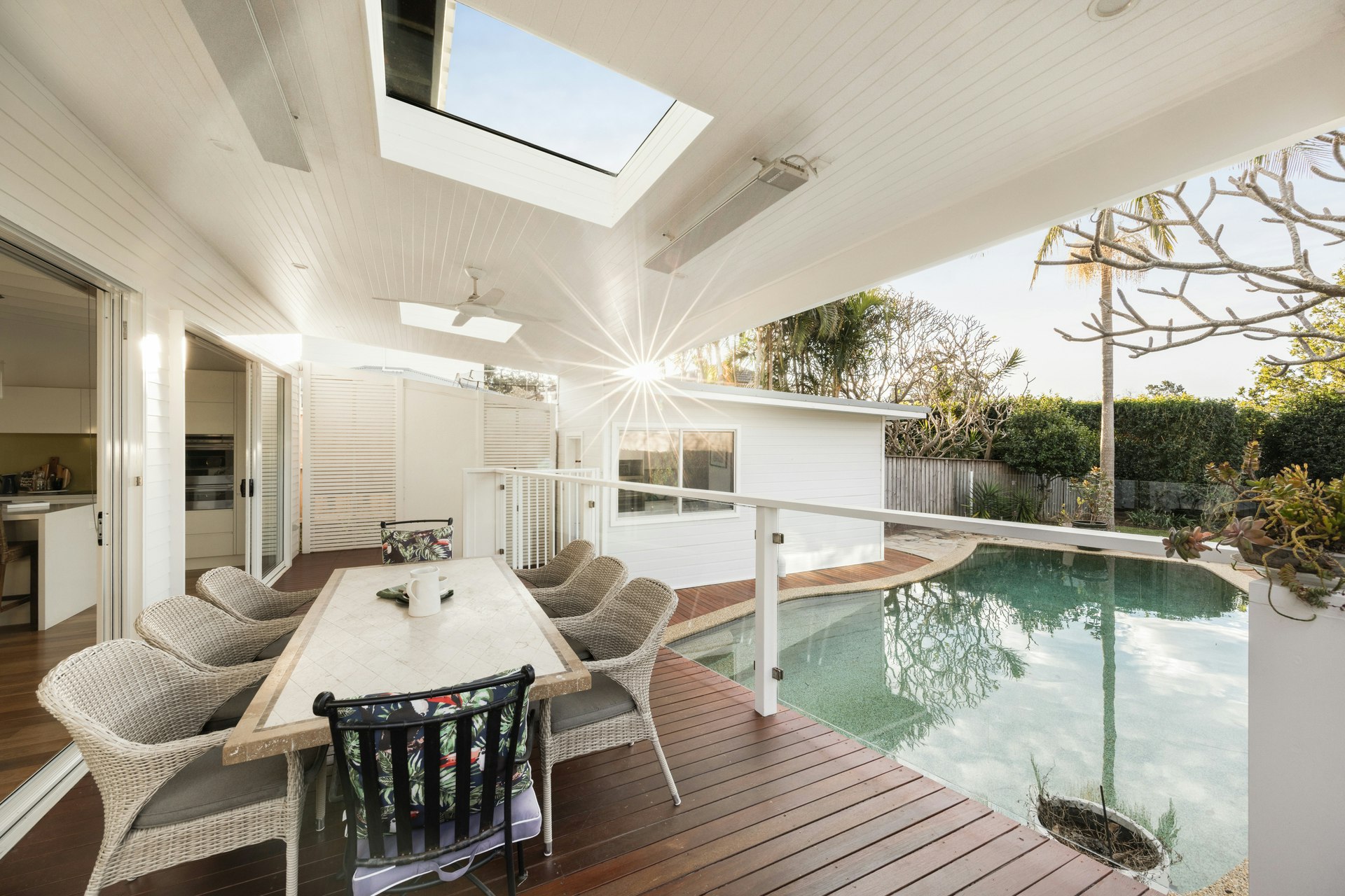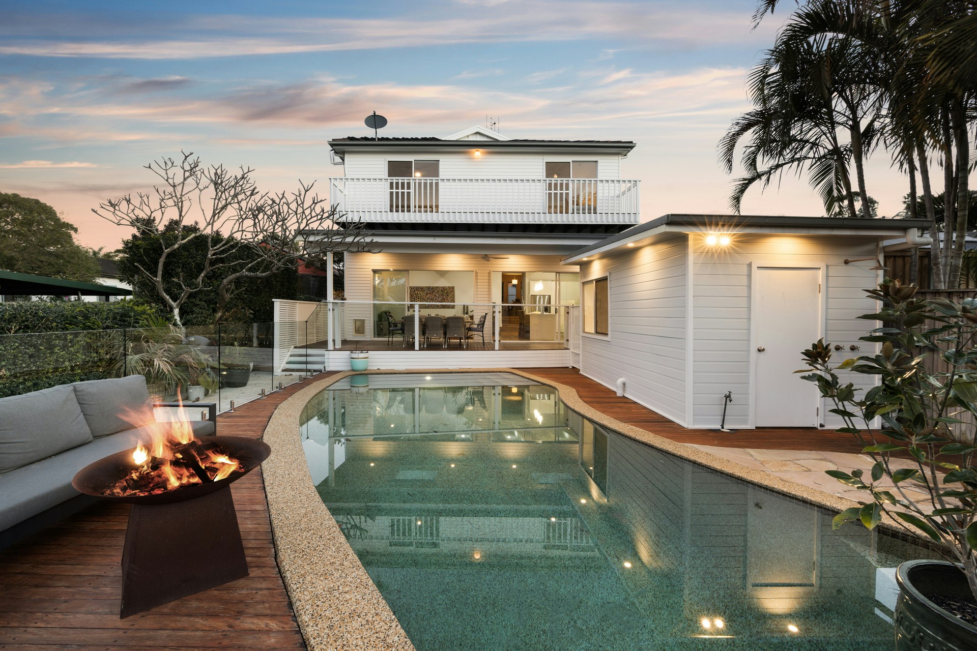 The main level features open-plan living and dining flowing to a stylish kitchen with island bench, breakfast bar, stainless steel appliances, and a double oven. The covered rear deck with skylights is perfect for entertaining, overlooking the pool, an outdoor fireplace, and a generous backyard with plenty of room to relax, play, or entertain.