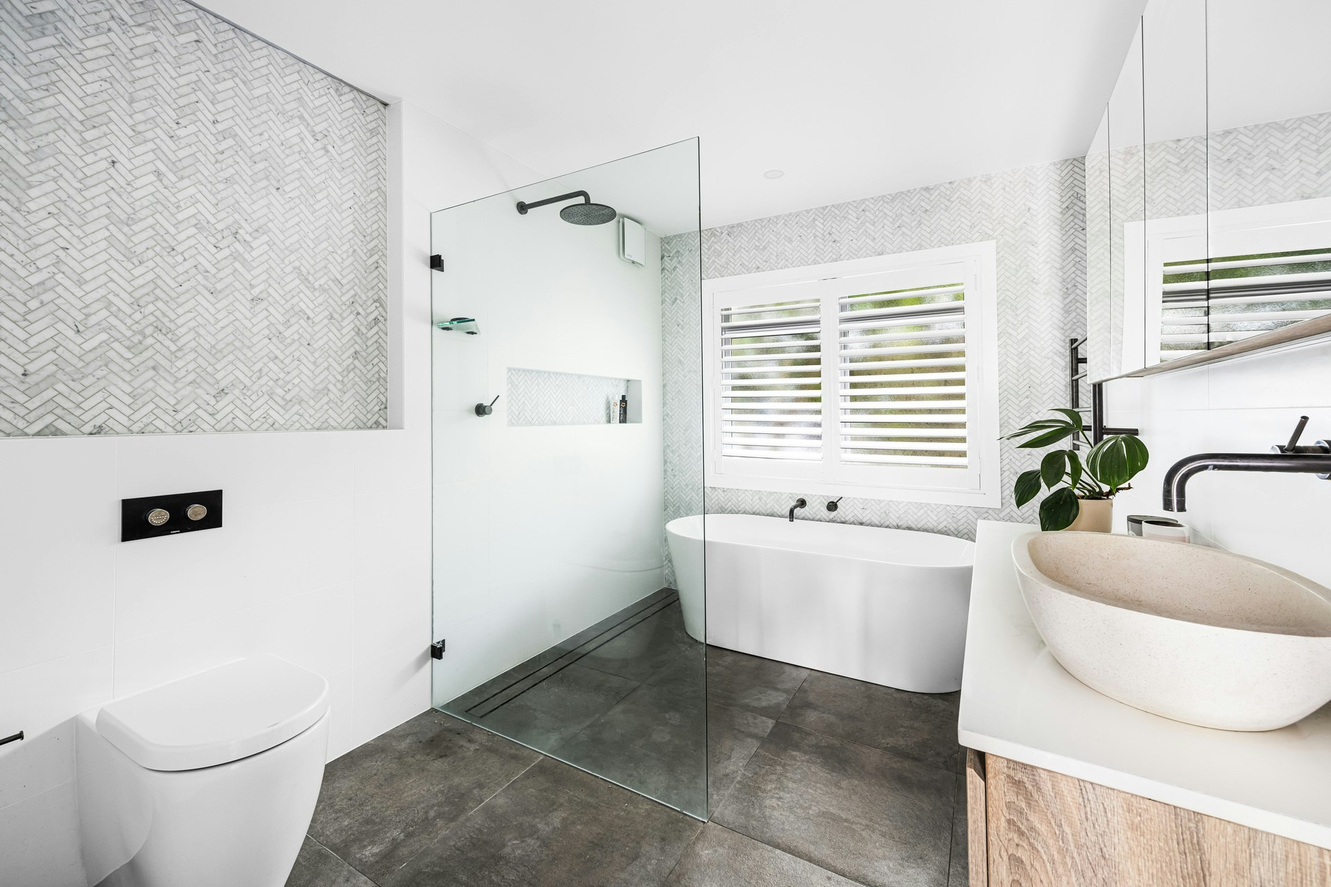 Stylish floor-to-ceiling tiled bathrooms with recessed shower shelves, floating vanities