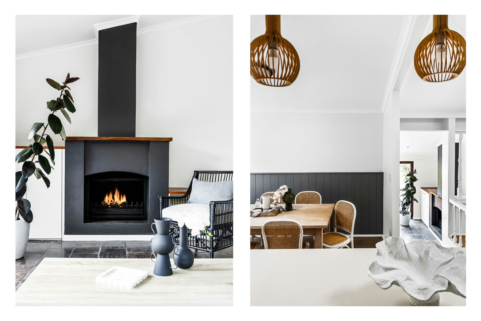Formal second living area with cosy wood burning fireplace and built-in cabinetry