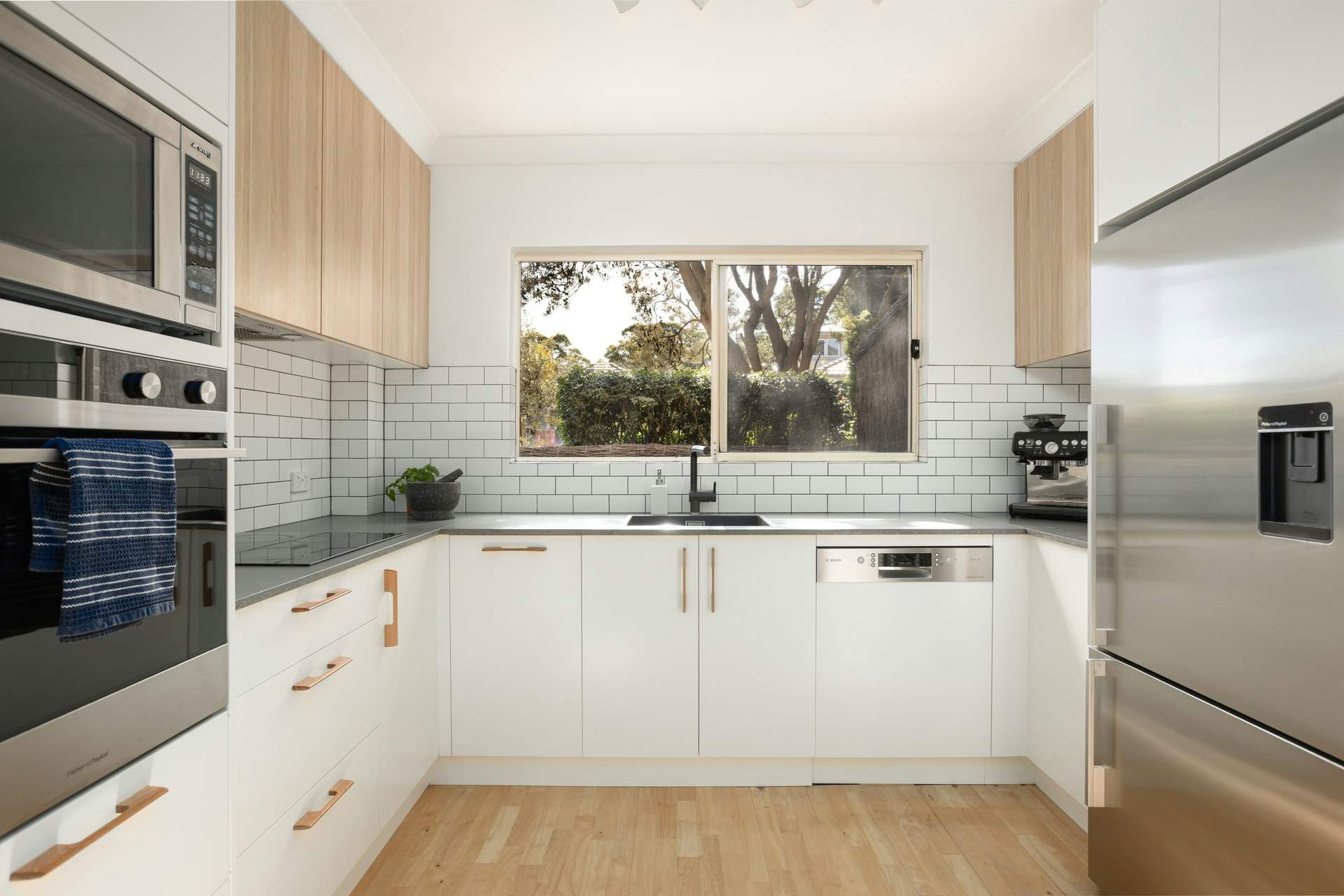 Nestled amid lush, established gardens, the home enjoys a peaceful first floor position with a private, north facing courtyard framed by greenery and a generous potted garden a serene retreat for relaxing or entertaining. Inside, the open-plan living, dining and kitchen area is filled with natural light thanks to the prized northerly aspect and seamless connection to the outdoor space. The layout promotes easy indoor outdoor flow, ideal for entertaining or simply enjoying a quiet moment in the sun.