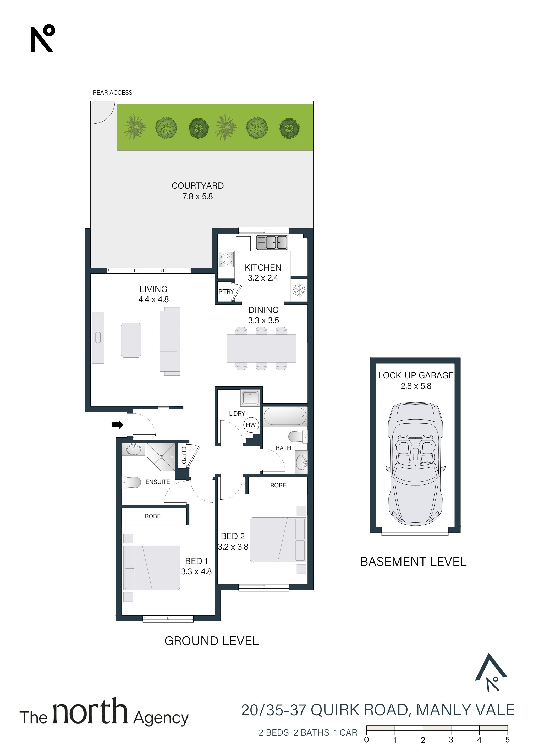 Accommodation includes two generous double bedrooms with built-in wardrobes. The master features its own ensuite, while a second well-kept bathroom and a full-sized internal laundry add to the practicality of the home. A secure lock-up garage and ample visitor parking are also included.