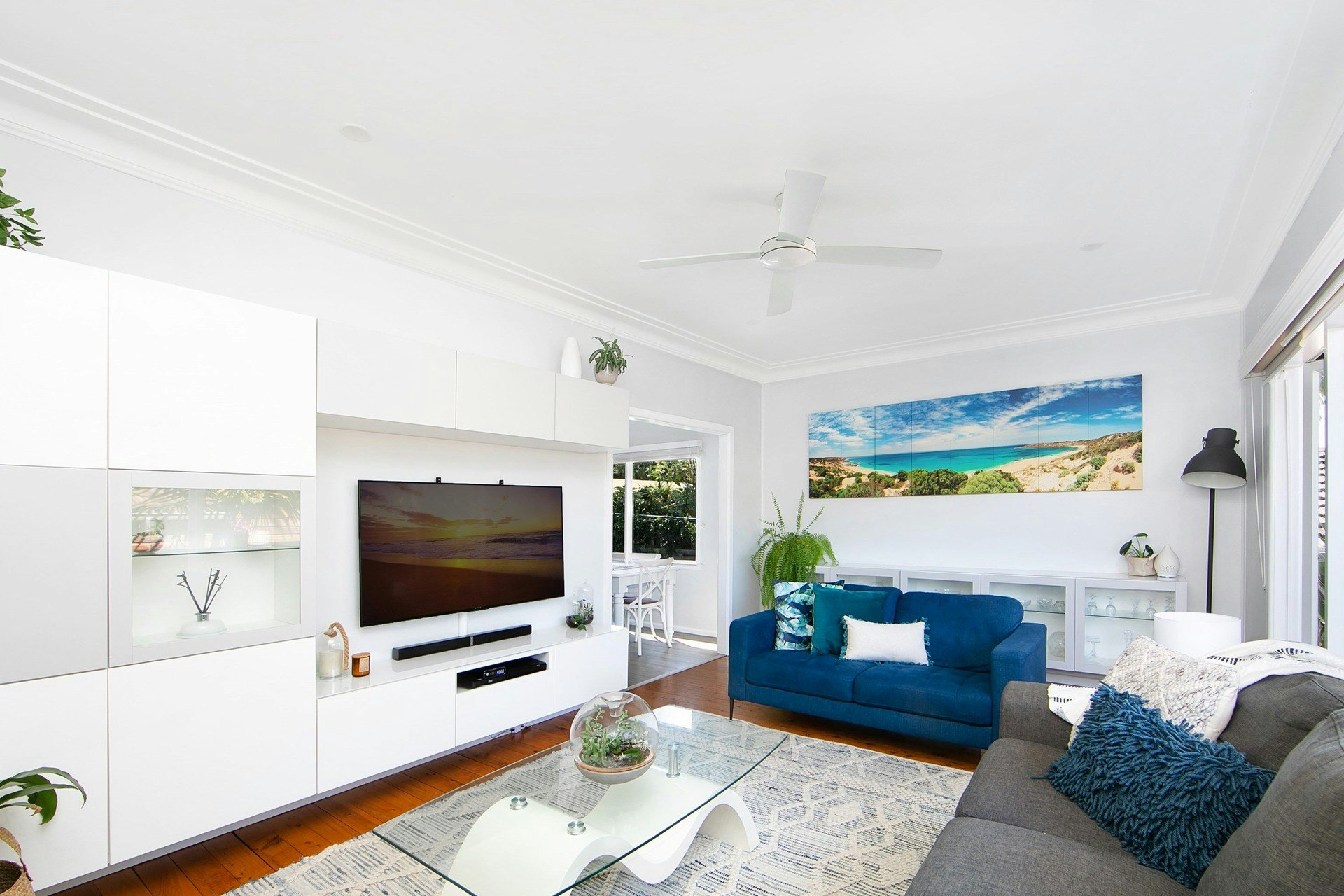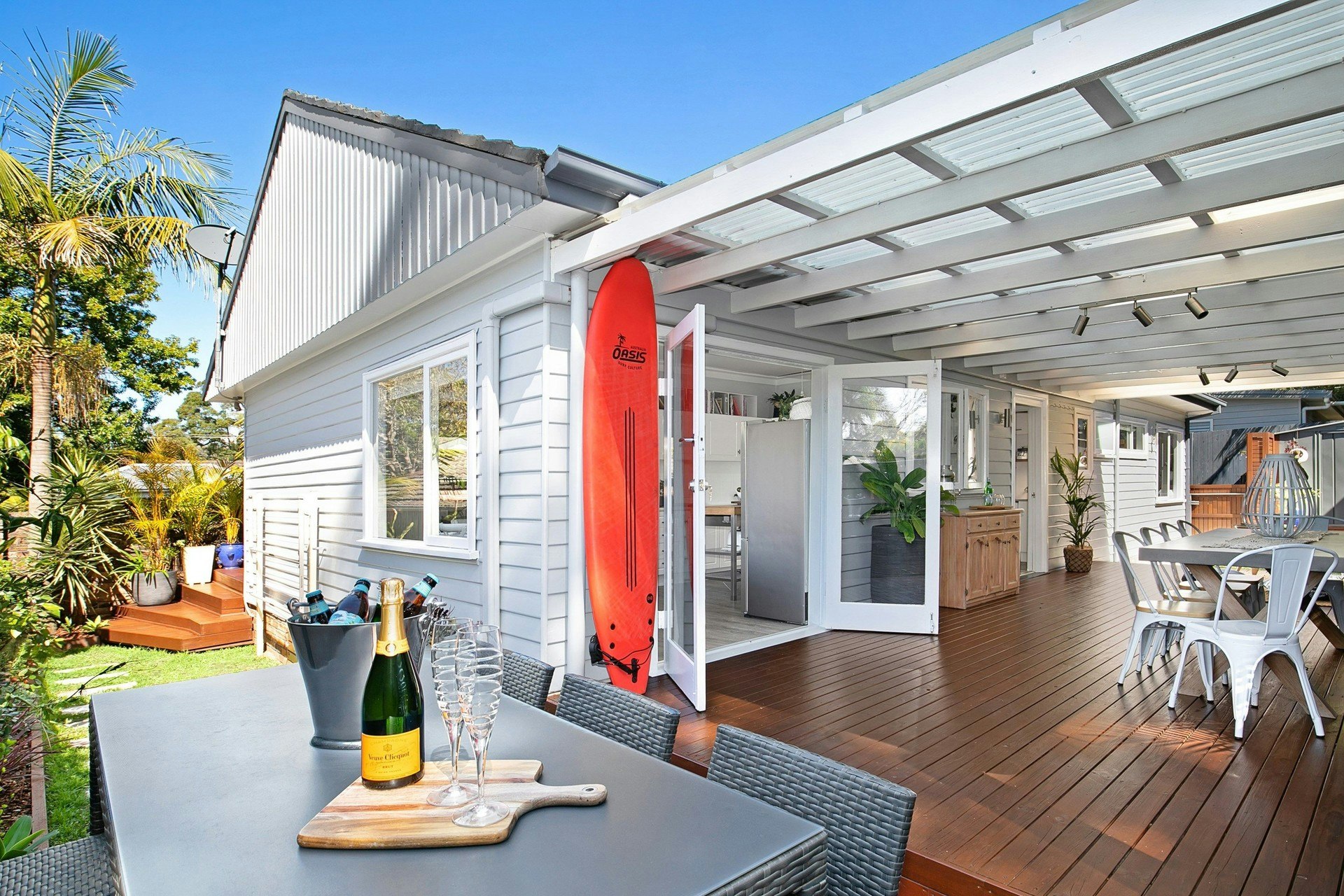 - Spacious light-filled living area with custom cabinetry opening to the front entertaining deck