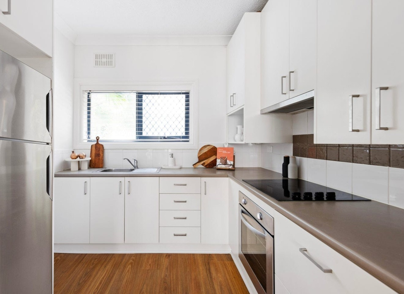 • Functional kitchen with electric cooktop and adjacent internal laundry