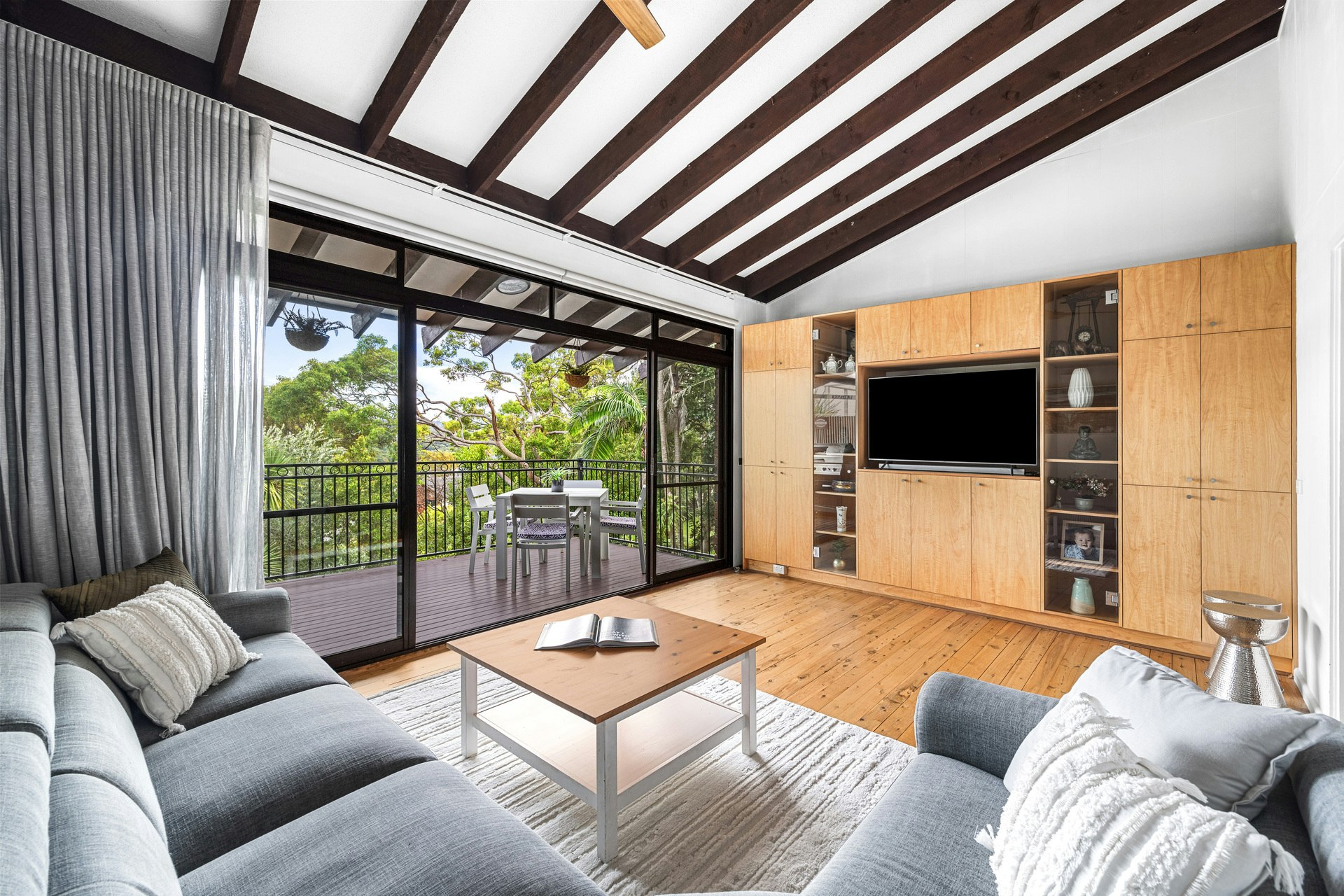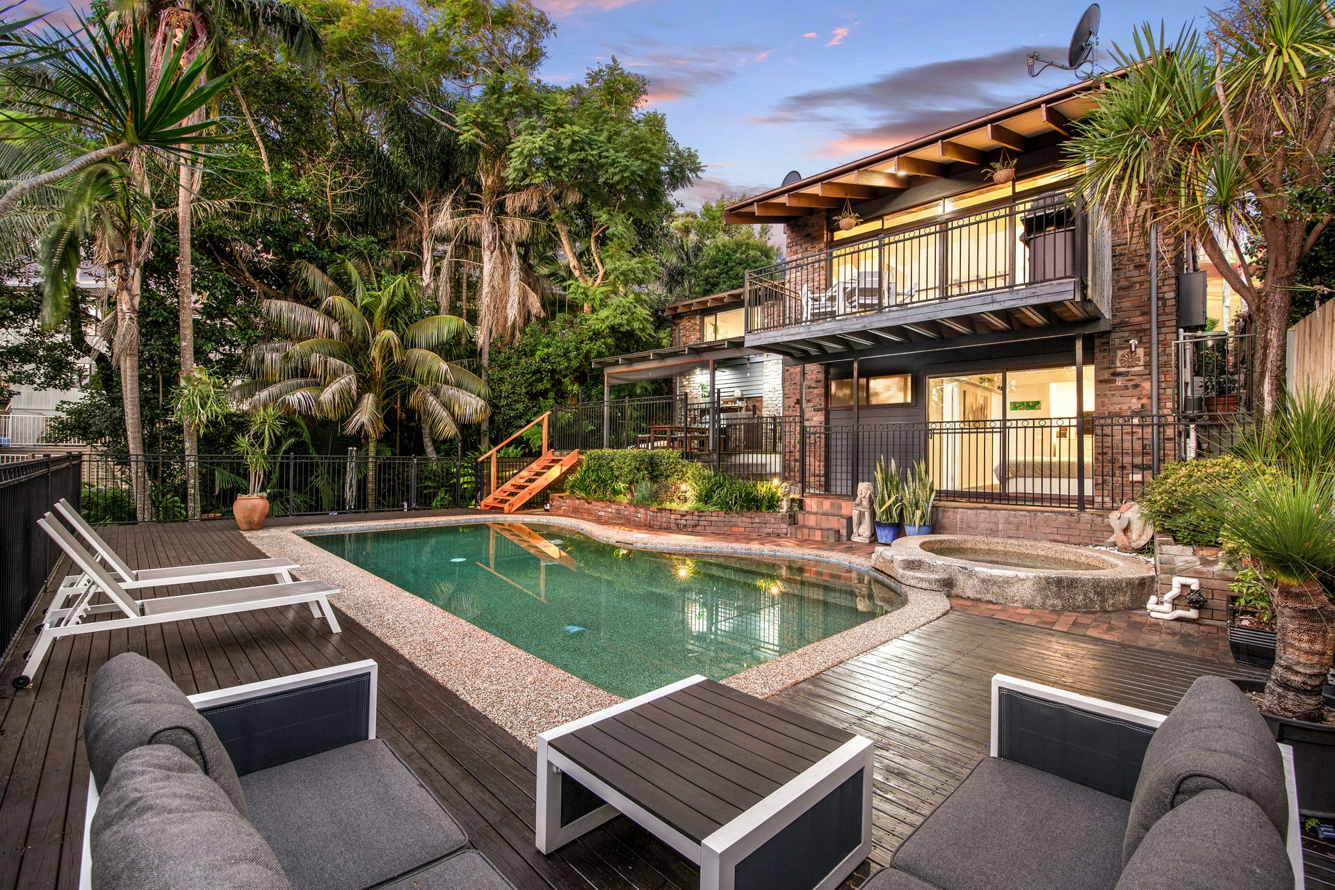 Upstairs, vaulted ceilings and exposed beams infuse the living areas and bedrooms with character and an airy ambiance. The light-filled living space effortlessly flows onto a covered balcony, providing a perfect vantage point for enjoying picturesque sunsets over the pool. Meanwhile, the private backyard beckons with its sheltered terrace overlooking the inviting pool and gas-heated spa, surrounded by lush tropical foliage.