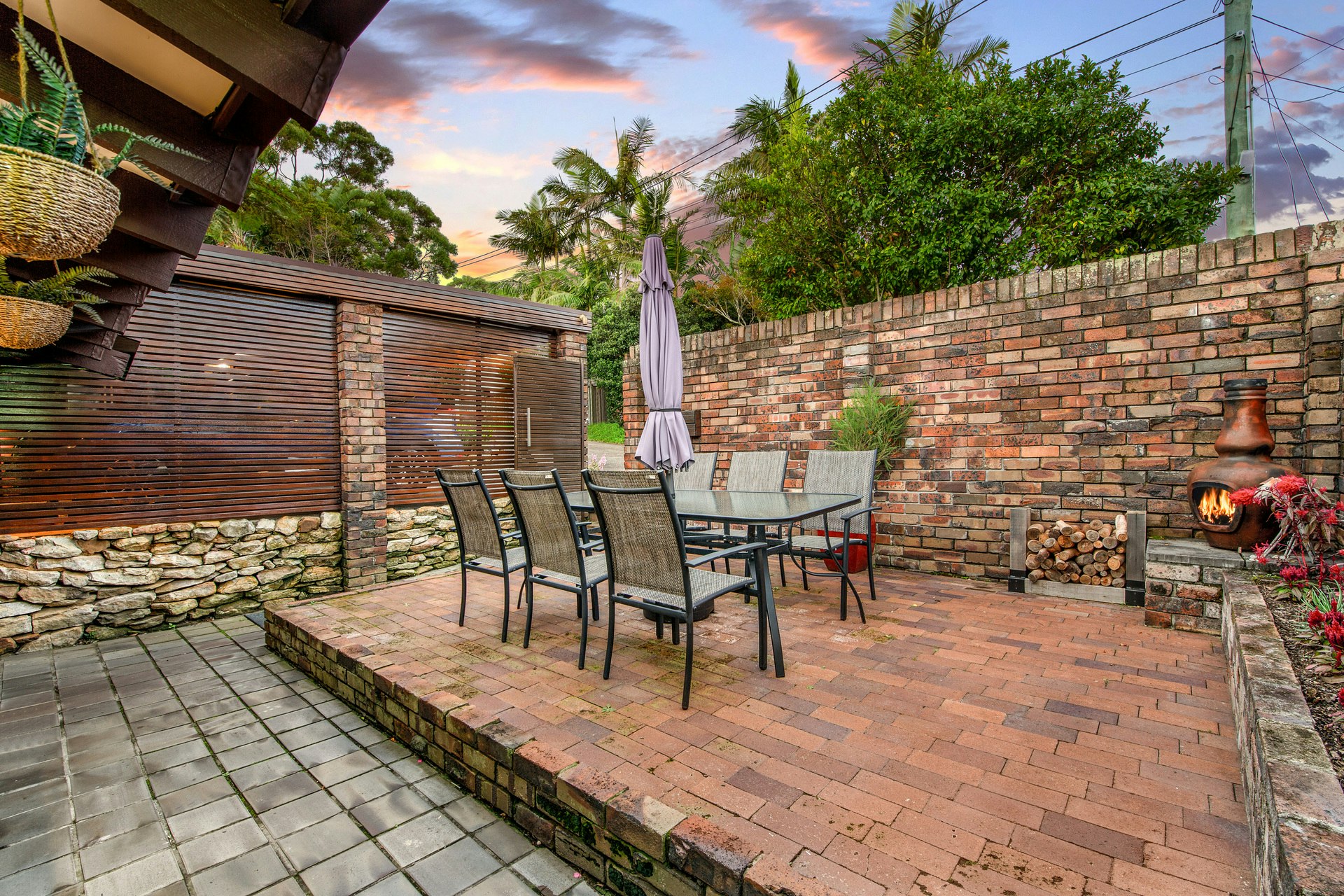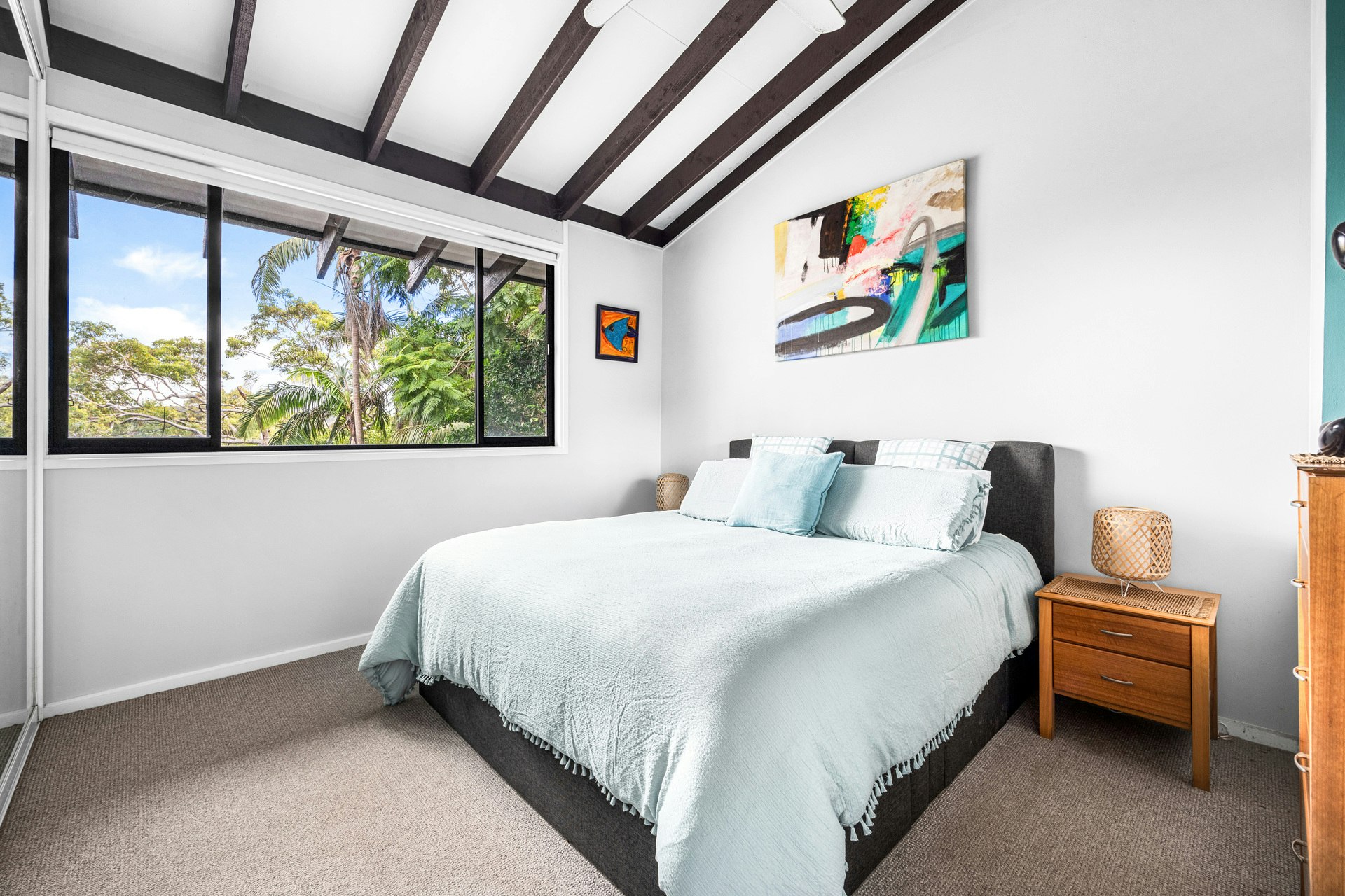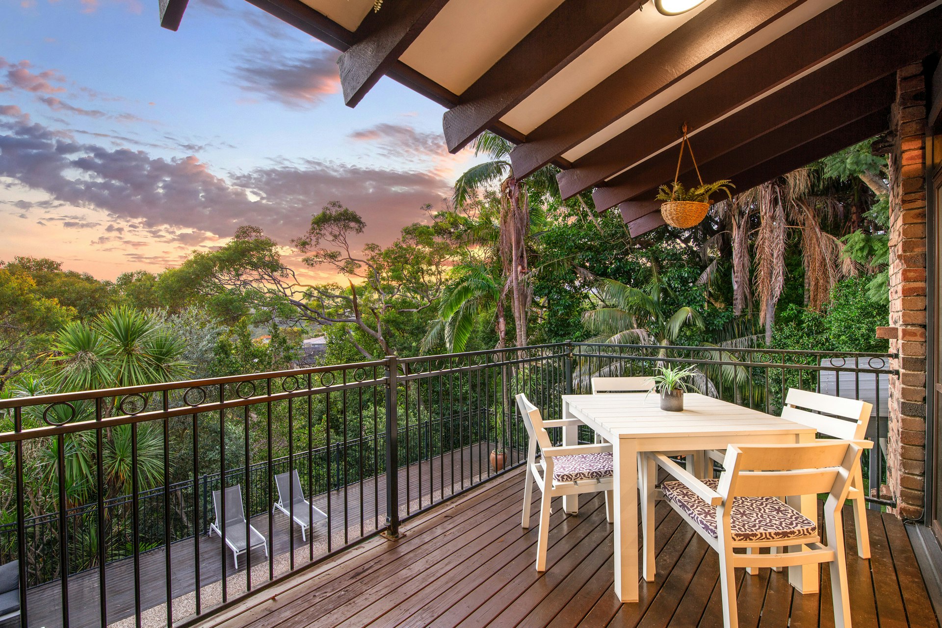 The modern kitchen, complete with stone countertops, breakfast bar, dishwasher, and adjoining laundry room, ensures meal preparation is a breeze. Upstairs, three bedrooms boasting built-in wardrobes offer serene bushland views, further enhancing the sense of tranquility.