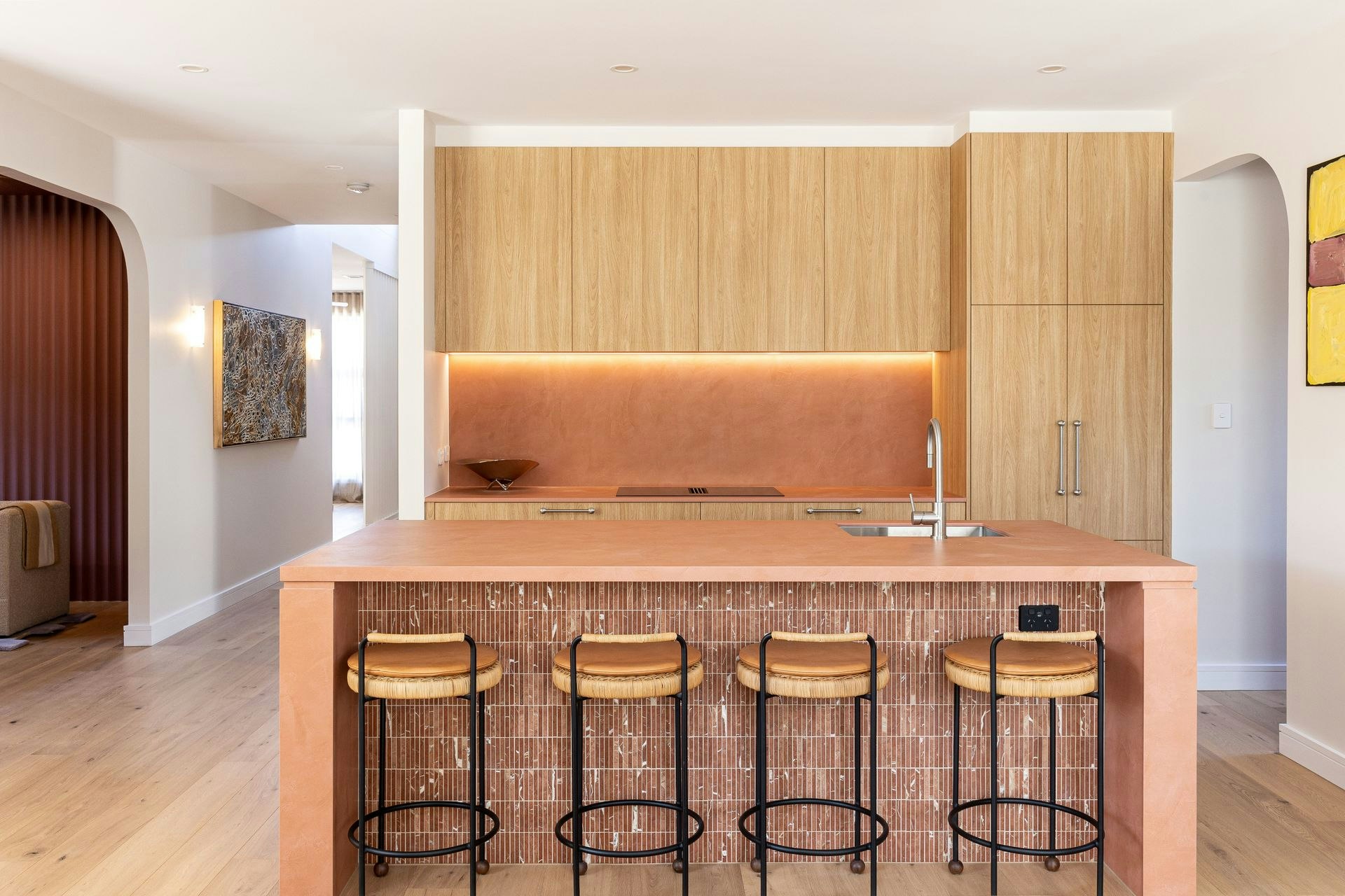 • Open plan Dekton island kitchen with integrated fridge and dishwasher, induction cooktop
