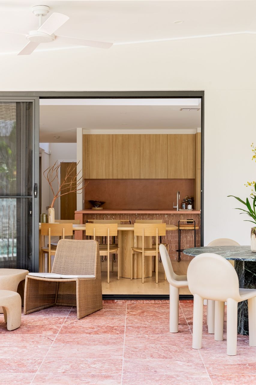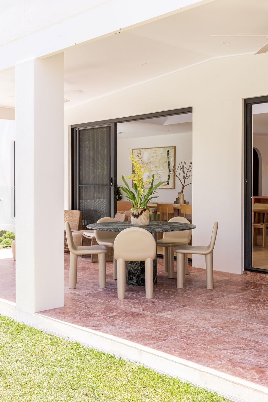 • Alfresco entertaining area with outdoor kitchen, bar fridge and ceiling fan, flows to the yard