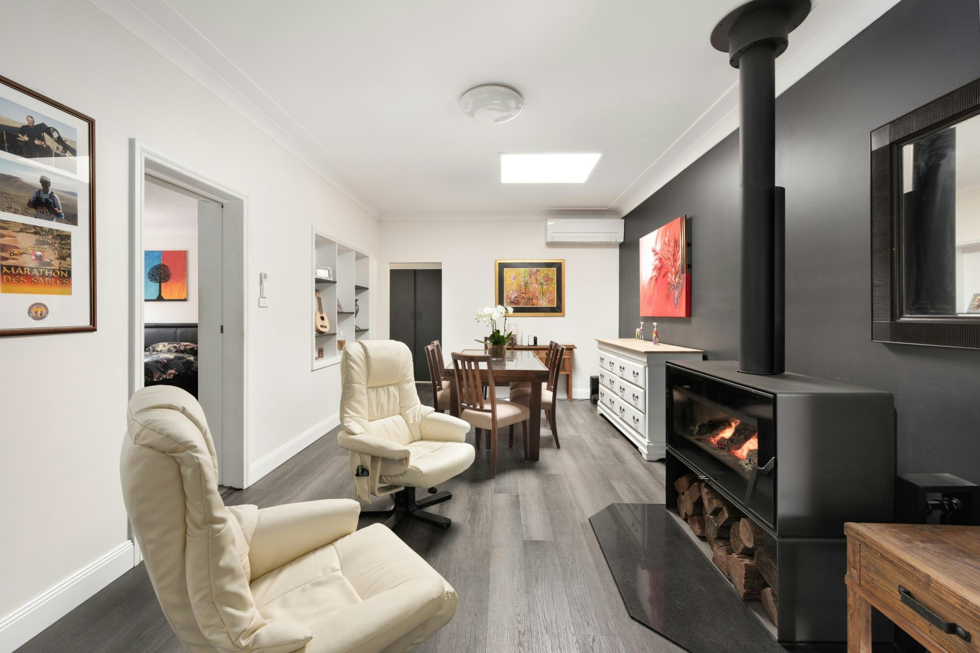 - Combined casual living and dining area with wood burner fireplace, air conditioning
