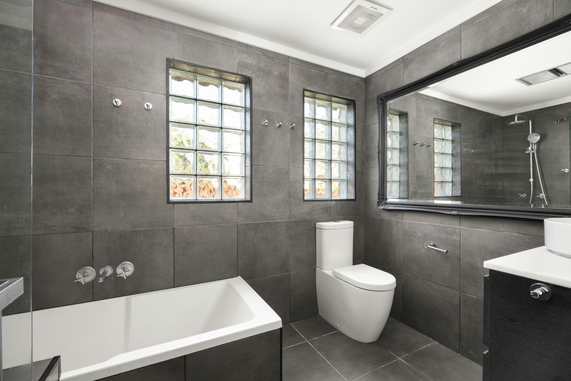 - Floor to ceiling tiled bathroom with floating vanity and frameless shower screen