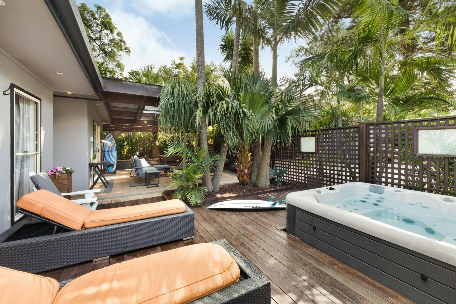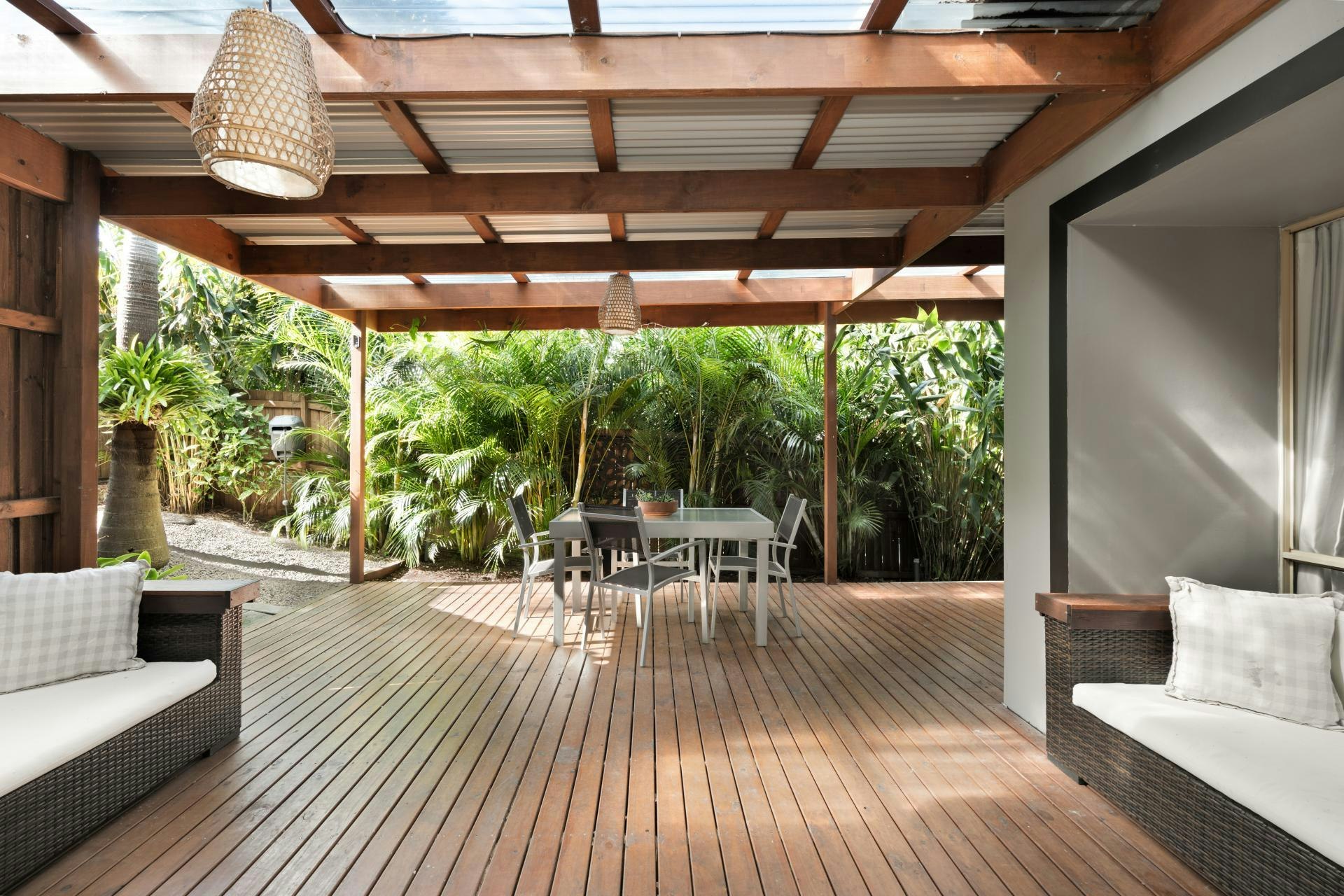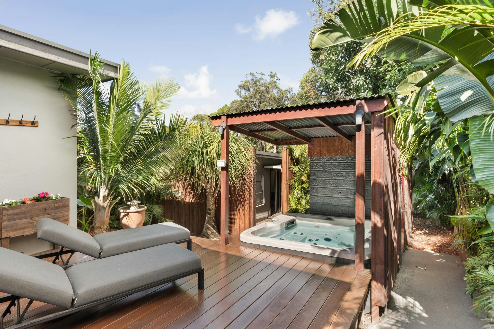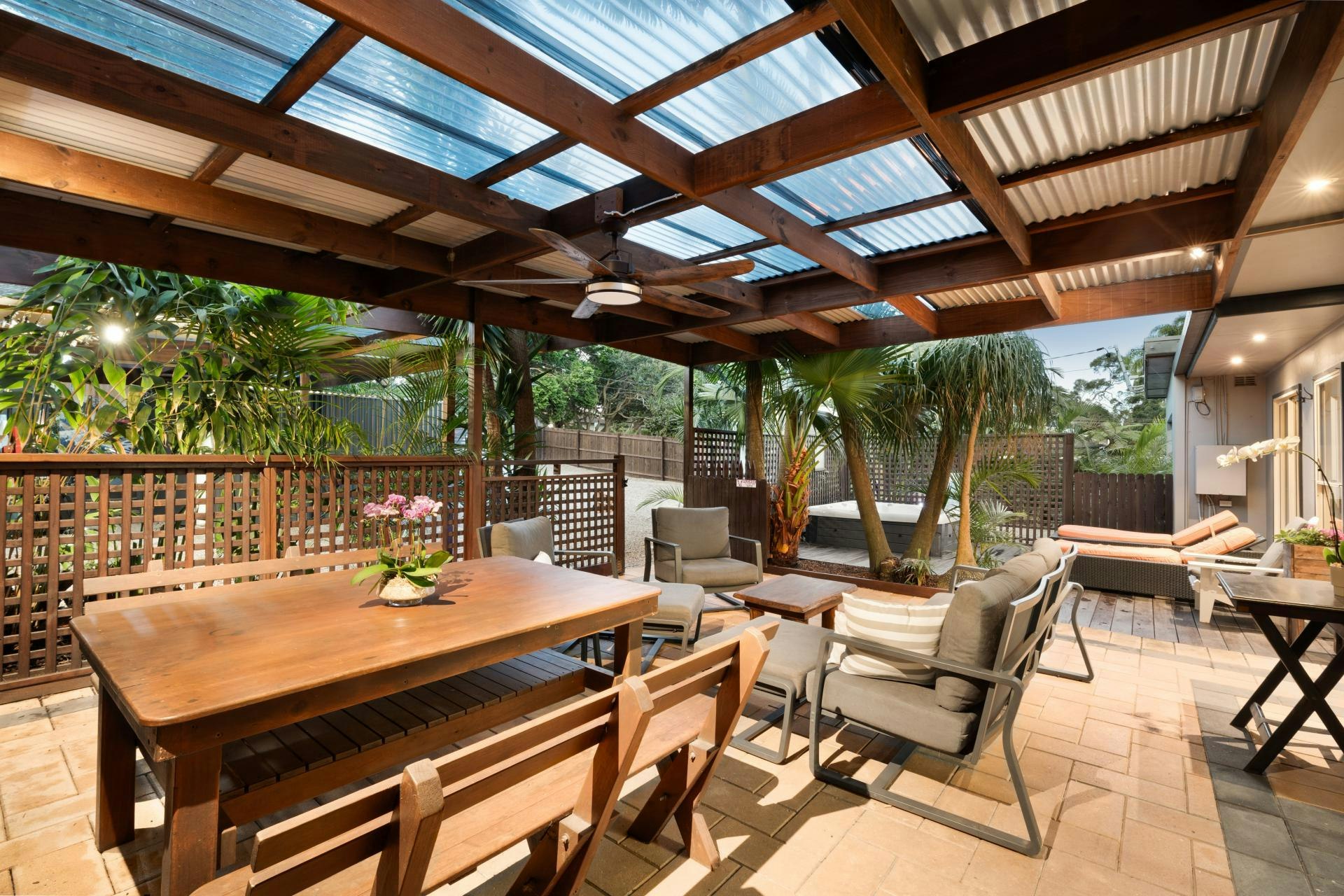 - North-Facing undercover entertaining area with ceiling fan and built-in spa bath