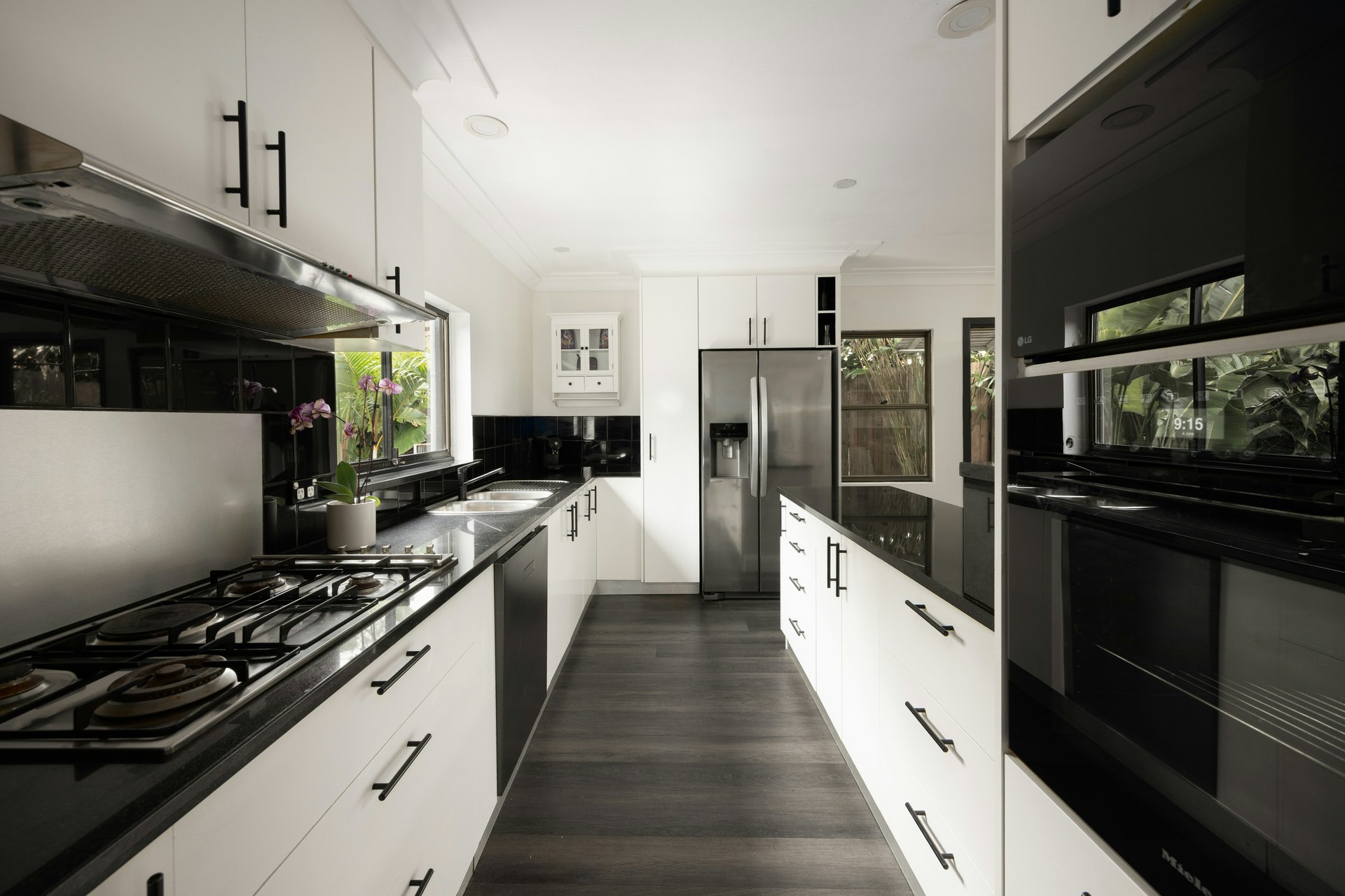 - Open plan stone kitchen with Smeg gas cooktop, full pantry, Asko dishwasher and Miele steam oven