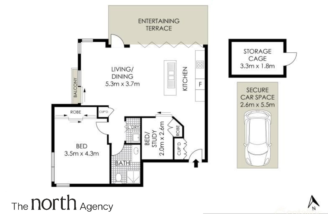 The spacious double bedroom includes a mirrored built-in robe, while the versatile second room is ideal as a study, home office, or guest bedroom. Additional highlights include air conditioning, a sparkling modern bathroom, internal laundry, and secure parking with a storage cage and lift access to all levels.