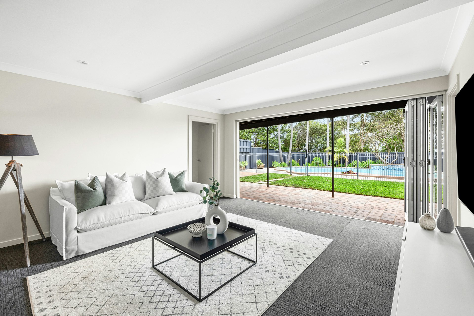 Lavish combined living and dining area opens fluidly to the outdoors through bi-folds