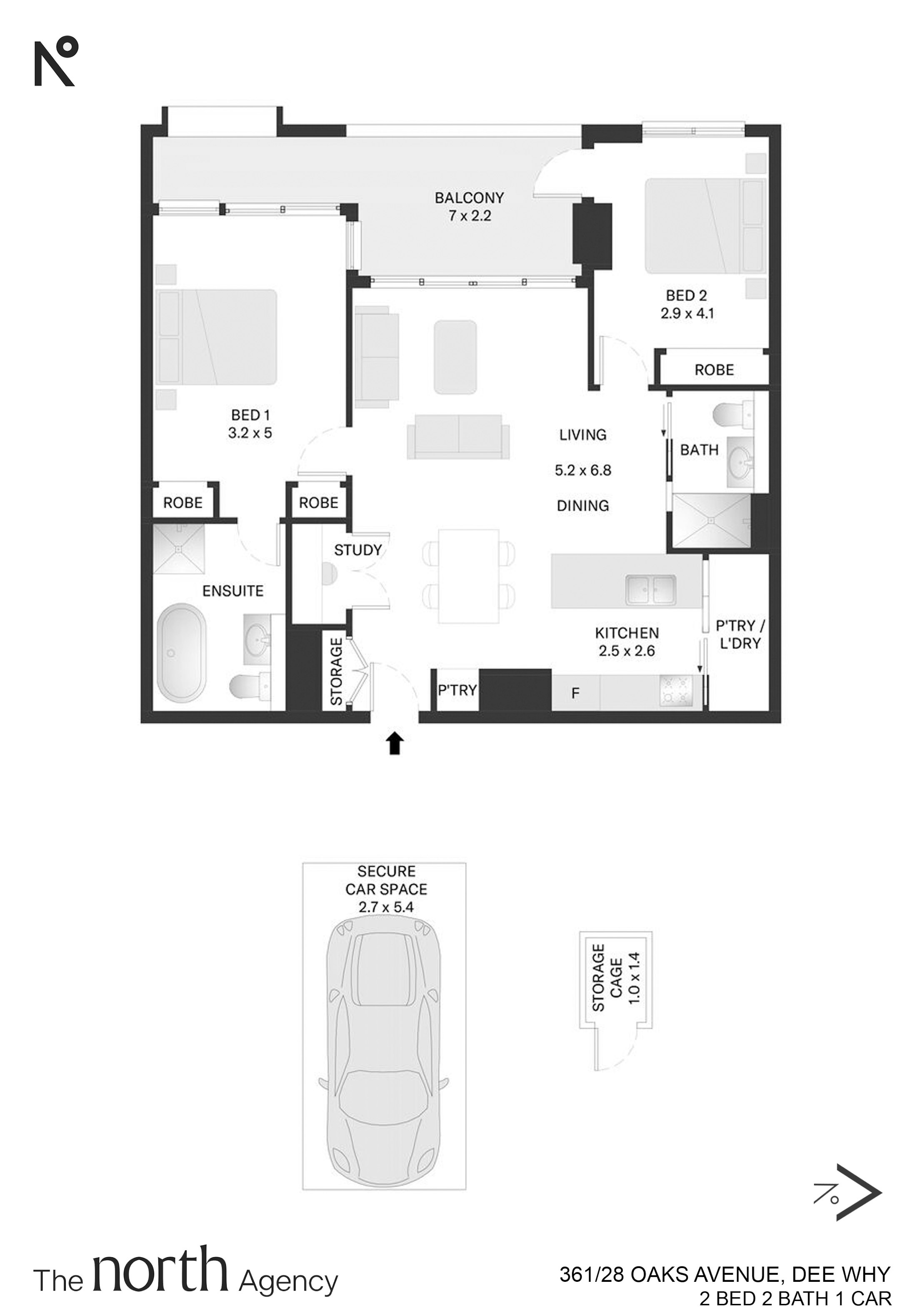 The open-plan kitchen, living and dining area extends to a spacious, enclosed double-length balcony—ideal for year-round entertaining, quiet morning coffee, or extra living space with added privacy. Both bedrooms are fitted with built-in wardrobes, with the master enjoying its own ensuite, while a separate study nook adds versatility for those working from home. Complete with internal laundry, ample storage, secure parking and a private storage cage, every detail has been considered for easy living.