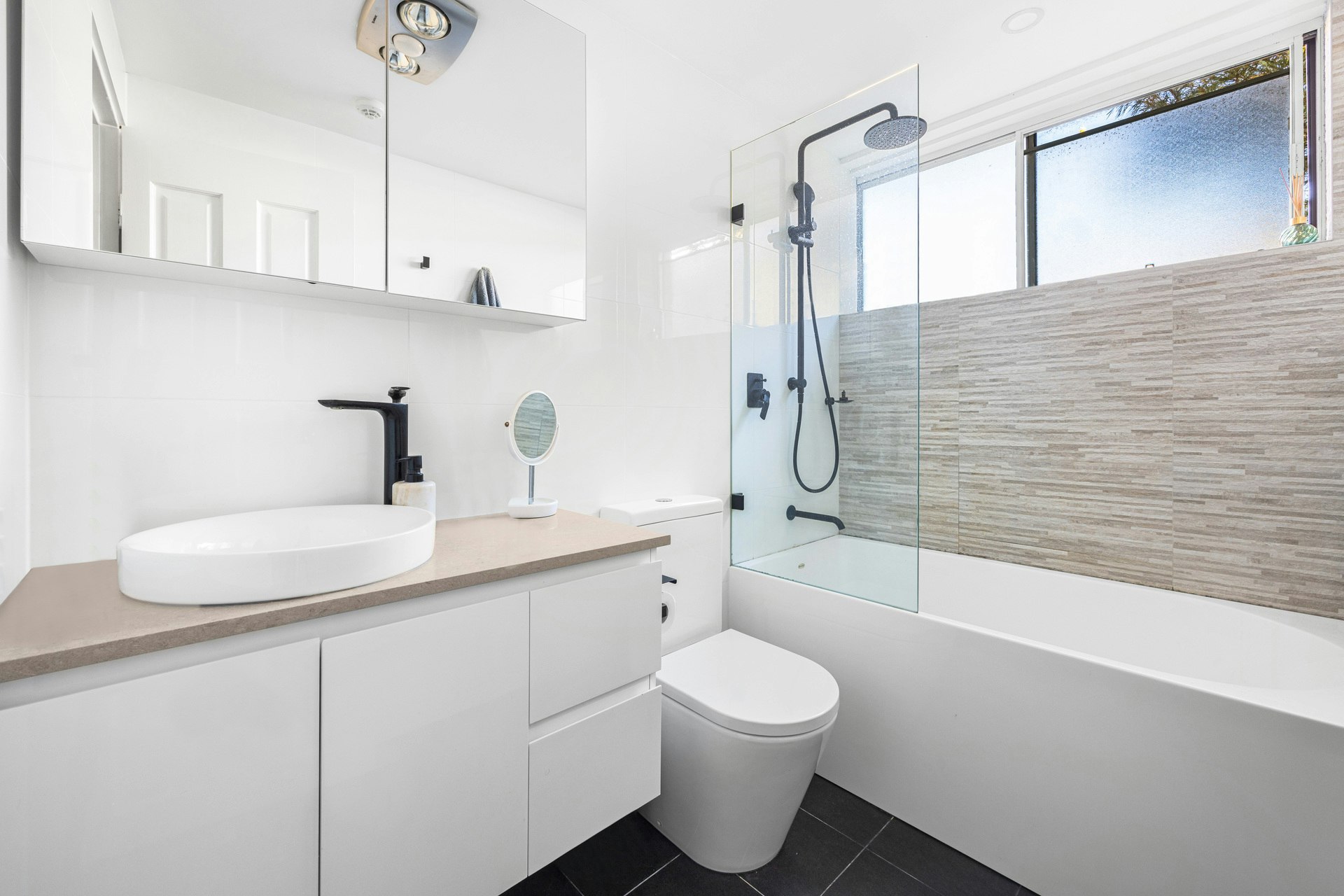 Modern bathroom with a bath over shower configuration