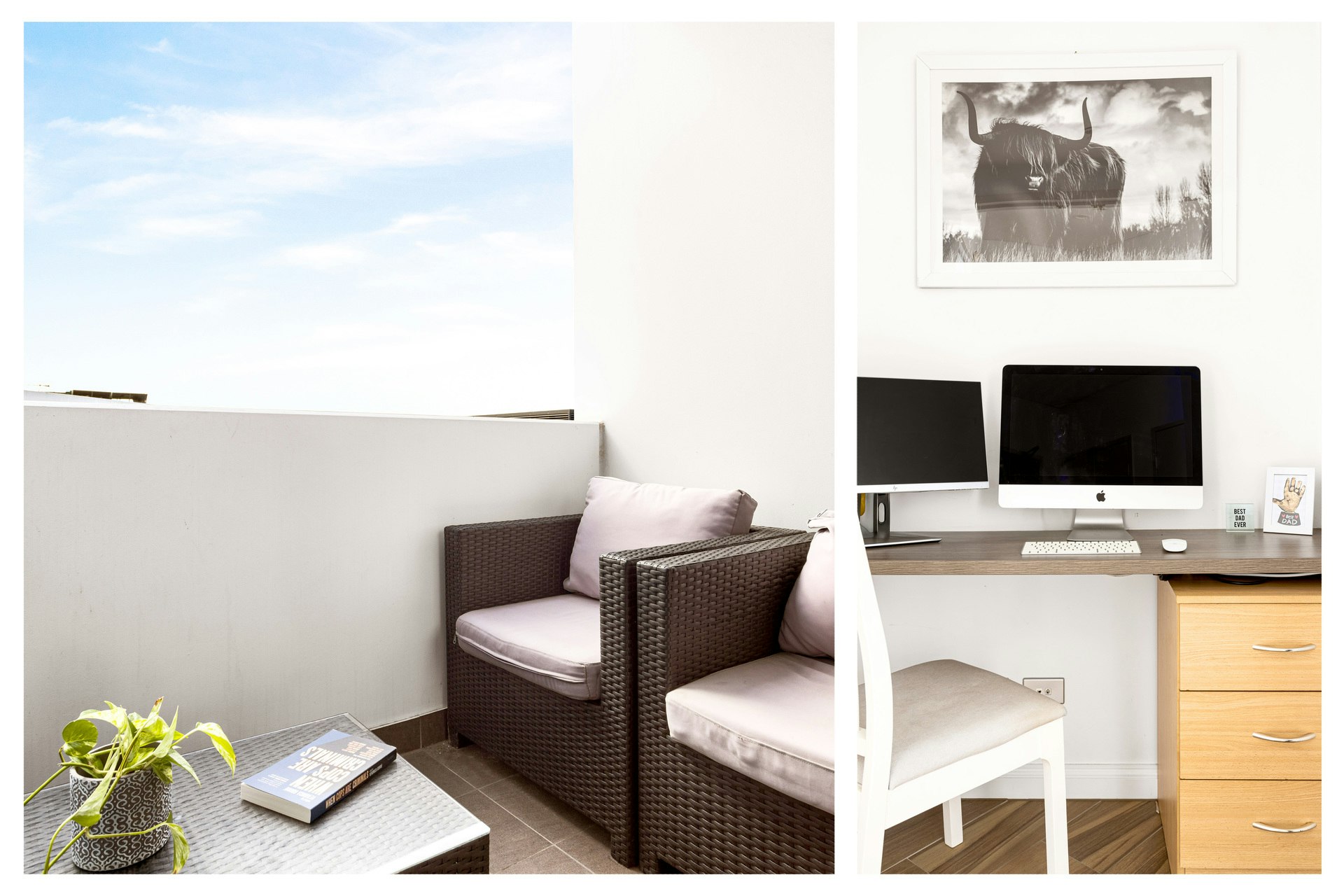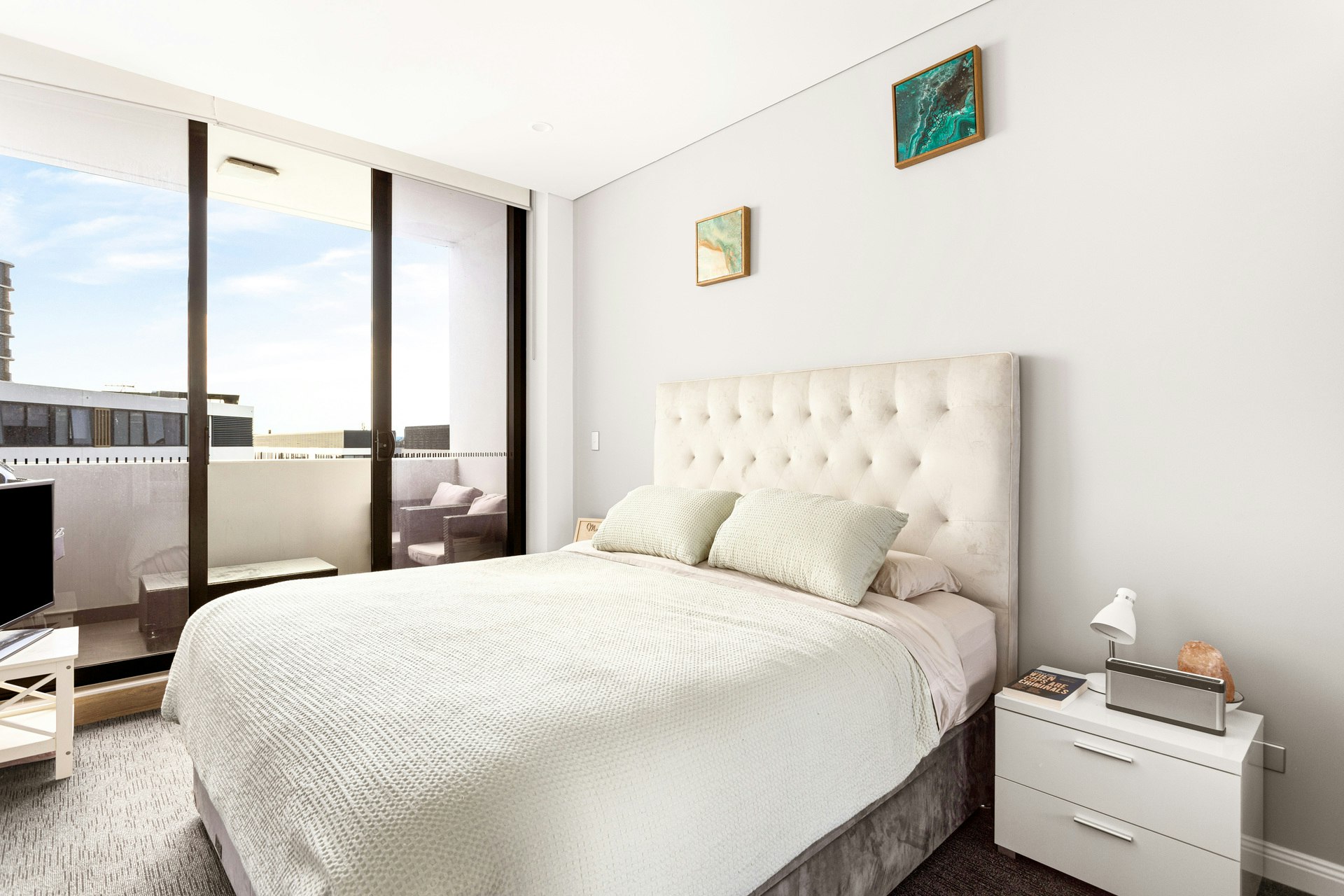 Both bedrooms have built-in wardrobes, with the master boasting an ensuite and private balcony (gas & water). A dedicated sunroom/home office adds versatility.