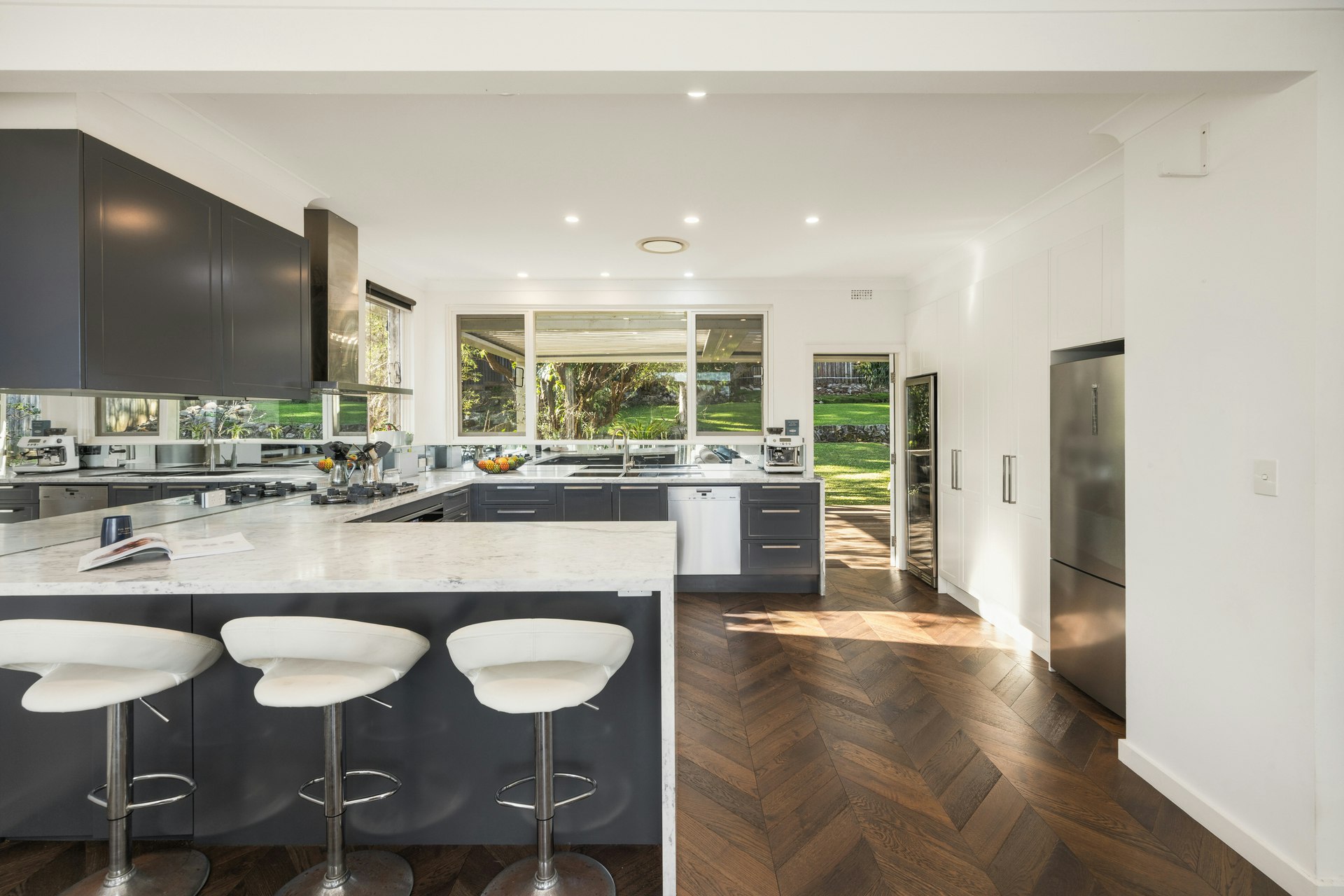 • Designer kitchen with natural marble benches, dishwasher, wine fridge, and excellent storage