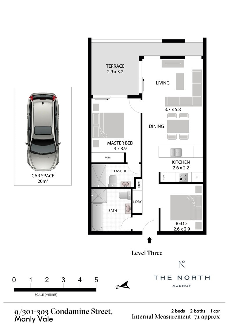 The internal area is 70sqm, the balcony is 13sqm and the car space is 19sqm which makes a total area of 102sqm.